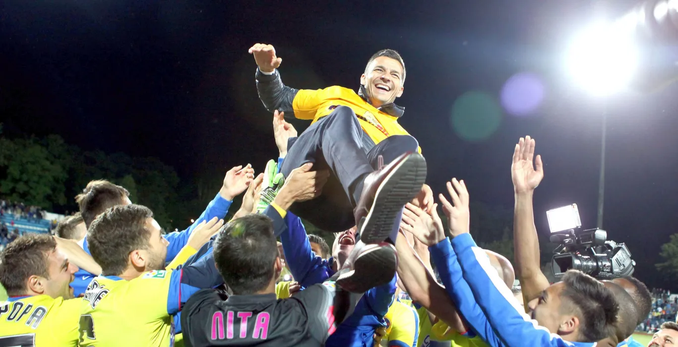 Costel Galca este aruncat in sus de jucatorii echipei Steaua Bucuresti, dupa castigarea titlului de campioni ai Romaniei.