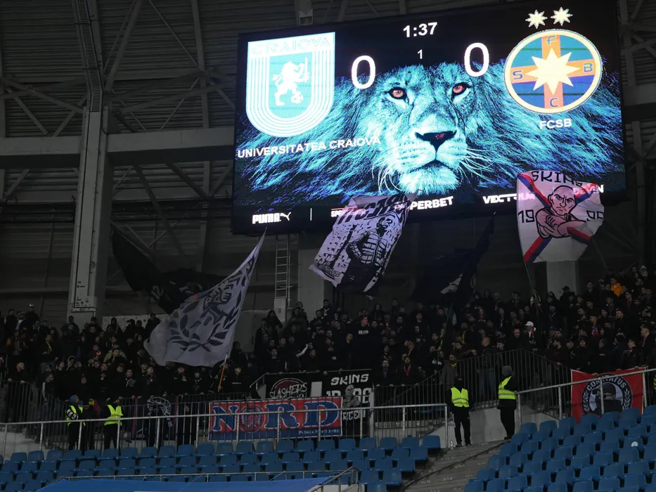 Galeria ros albastra prezenta, alături de tabela de marcaj, in peluza la meciul de fotbal dintre Universitatea Craiova si FCSB, contand pentru Superliga Superbet, desfasurat pe Stadionul Ion Oblemenco din Craiova, duminica 15 februarie 2026. © FOTO:Razvan Pasarica/SPORT PICTURES