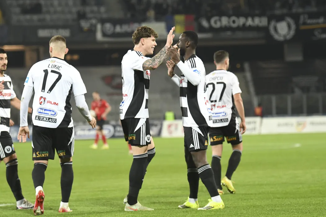 Andrei Coubis il felicita pe Issouf Macalou dupa un gol marcat in meciul de fotbal dintre FC Universitatea Cluj si FK Csikszereda Miercurea Ciuc, contand pentru Superliga Superbet, desfasurat pe Cluj Arena din Cluj-Napoca, sambata 14 februarie 2026. © FOTO:Flaviu Buboi/SPORT PICTURES