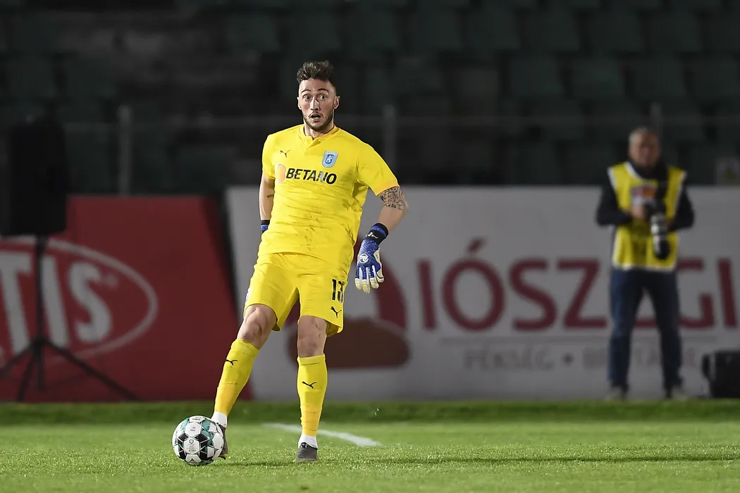 Mirko Pigliacelli (S), de la Universitatea Craiova, suteaza in timpul meciului de fotbal contra echipei Sepsi OSK din etapa 6 a play-off-ului Ligii 1, disputat pe stadionul Municipal din Sfantu Gheorghe, miercuri, 5 mai 2021. ALEX NICODIM / MEDIAFAX FOTO