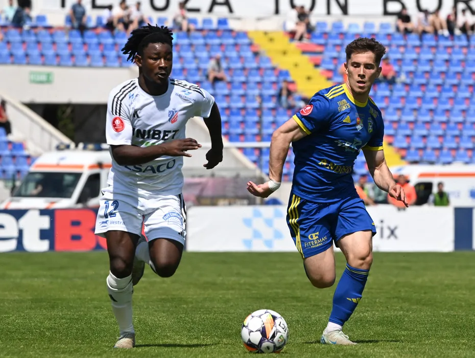 Friday Adams si Laurentiu Constantin Vlasceanu in meciul de fotbal dintre FC Botosani si AFC Unirea 04 Slobozia, contand pentru Superliga Superbet Play-Out, desfasurat pe Stadionul Municipal din Botosani, sambata 3 mai 2025. © FOTO: Tudi/SPORT PICTURES