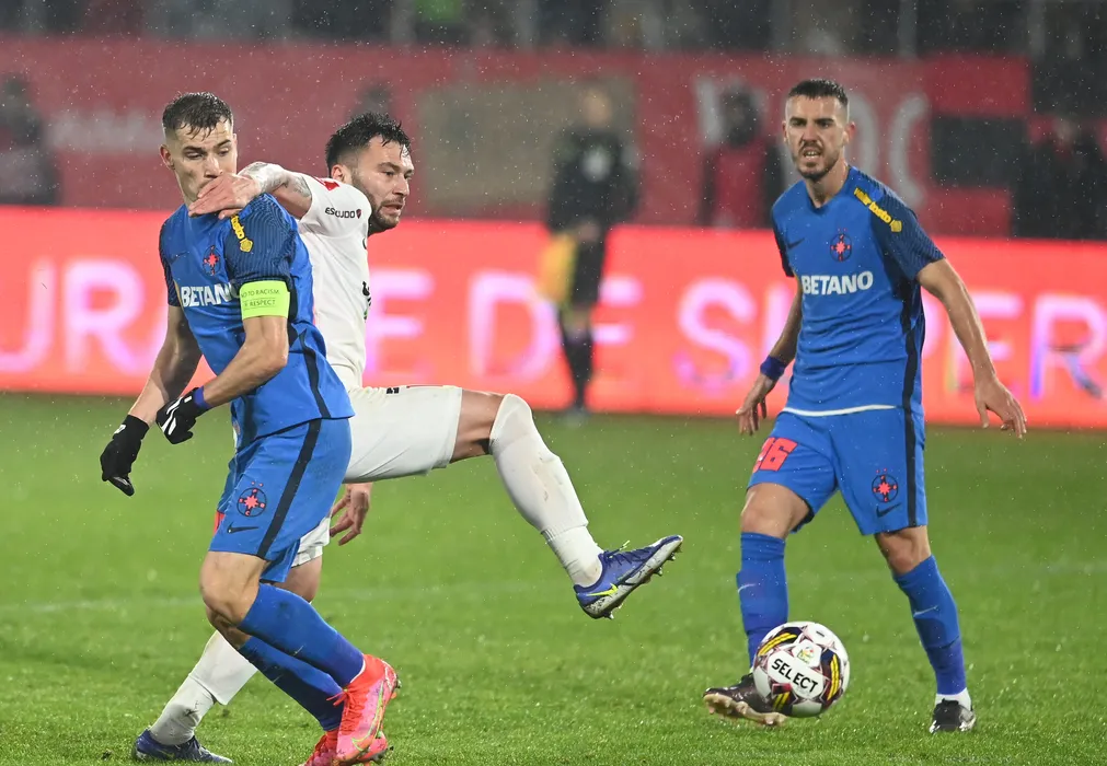Darius Dumitru Olaru, Ilie Alexandru Rauta si Razvan Constantin Oaida in meciul de fotbal dintre FC Hermannstadt si FCSB, contand pentru Superliga Superbet, desfasurat pe Stadionul Municipal din Sibiu, duminica 22 ianuarie 2023. © FOTO:Razvan Pasarica/SPORT PICTURES