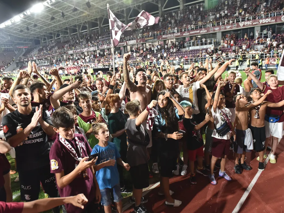 Tinerii suporteri rapidisti alaturi de fotbalistii Horatiu Alexandru Moldovan si Cristian Ionut Sapunaru saluta galeria dupa saluta galeria dupa meciul de fotbal dintre Rapid Bucuresti si UTA Arad, contand pentru Superliga Superbet, desfasurat pe Stadionul Rapid Giulesti din Bucuresti, sambata 20 august 2022. © FOTO:Razvan Pasarica/SPORT PICTURES