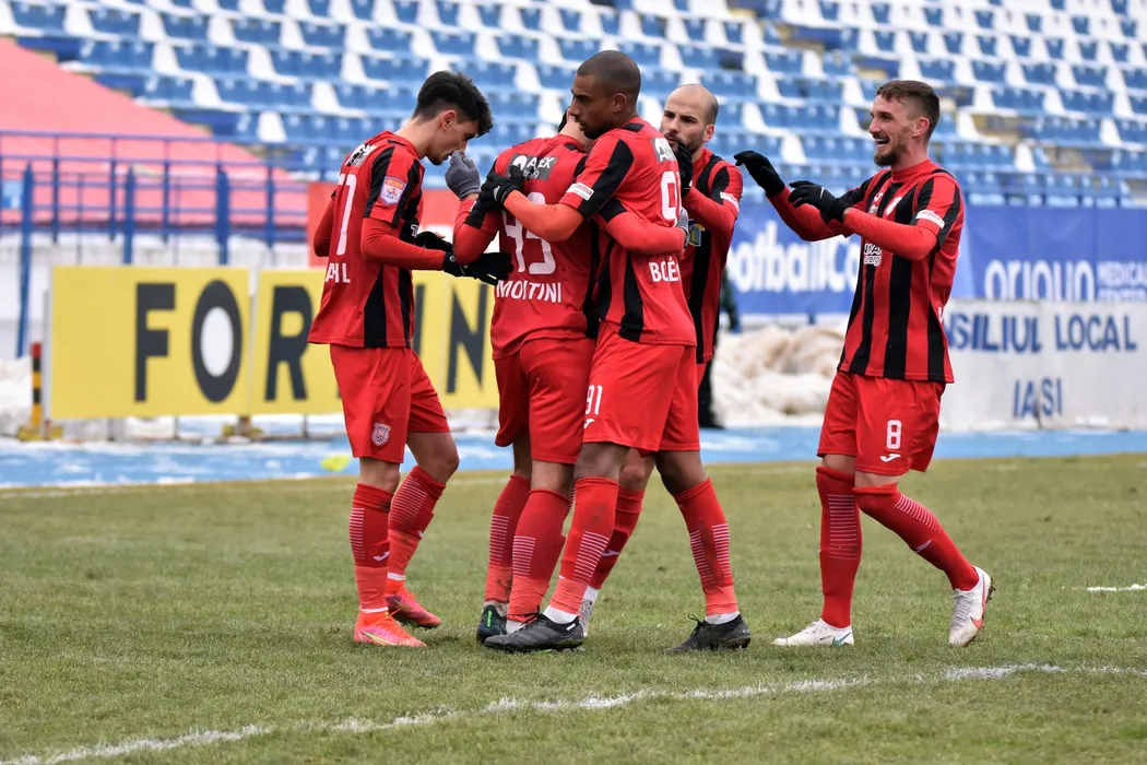 Jucatorii formatiei Astra Giurgiu reactioneaza dupa inscrierea unui gol in timpul meciului de fotbal dintre CSM Politehnica Iasi si Astra Giurgiu din etapa a XXIII-a a Ligii 1, disputat pe stadionul Emil Alexandrescu din Iasi, duminica 14 februarie 2021. DRAGOS PASCANEANU / MEDIAFAX FOTO
