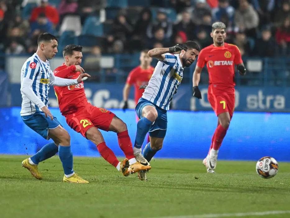 Alexandru Mihail Baluta marcheaza un gol de langa Stefan Stefanovici si Carlos Eduardo Bacila Jatoba in meciul de fotbal dintre Politehnica Iasi si FCSB, din cadrul Superligii Superbet, desfasurat pe Stadionul Emil Alexandrescu din Iasi, marti 19 decembrie 2023. © FOTO:Razvan Pasarica/SPORT PICTURES