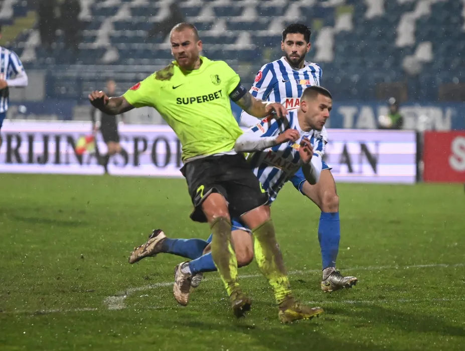 Denis Alibec și David Atanaskoski, Nicolas Samayoa în meciul de fotbal dintre Poli Iași si FC Farul Constanța, contând pentru SuperLiga Superbet, desfășurat pe Stadionul Emil Alexandrescu din Iași, duminică 8 decembrie 2024. © FOTO: Tudi/SPORT PICTURES