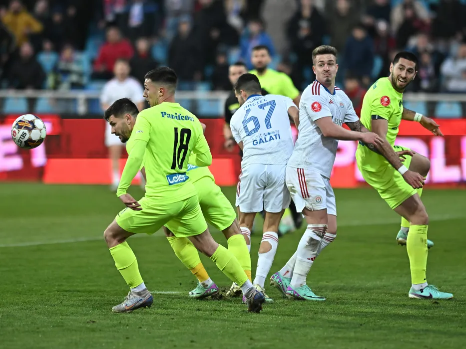 Stefan Stefanovici, Alexandru Mihai Constantin Pop si Nicolas Samayoa in meciul de fotbal dintre Otelul Galati si Politehnica Iasi, din cadrul Play-out-ului Superligii Superbet, desfasurat pe Stadionul Otelul din Galati, sambata 16 martie 2024. © FOTO:Razvan Pasarica/SPORT PICTURES