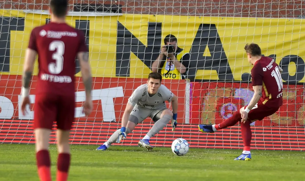 Ciprian Ioan Deac marcheaza un gol anulat din penalty in poarta lui Mihai Maximilian Popa la meciul de fotbal dintre FC Voluntari si CFR Cluj, contand pentru Play-off-ul Ligii 1 Casa Pariurilor, desfasurat pe Stadionul Anghel Iordanescu din Voluntari, duminica 24 aprilie 2022. © FOTO:Razvan Pasarica/SPORT PICTURES