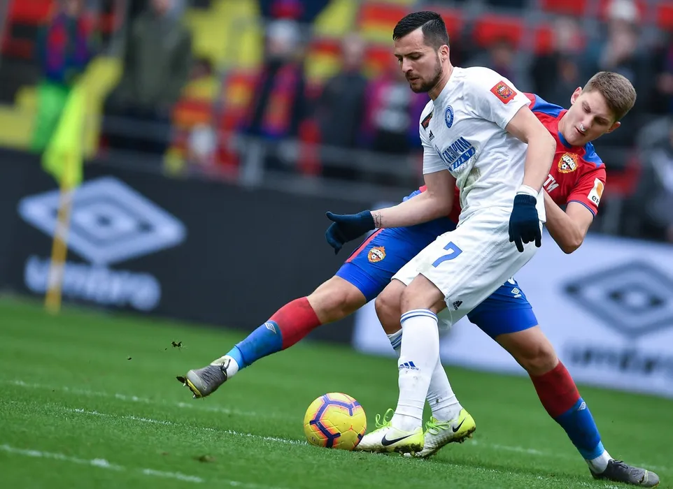 5846991 13.04.2019 Orenburg's Djordje Despotovic, front, and CSKA's Igor Diveev struggle for a ball during the Russian Premier-League soccer match between CSKA Moscow and Orenburg, in Moscow, Russia.,Image: 426057758, License: Rights-managed, Restrictions: Editors' note: THIS IMAGE IS PROVIDED BY RUSSIAN STATE-OWNED AGENCY SPUTNIK., Model Release: no
