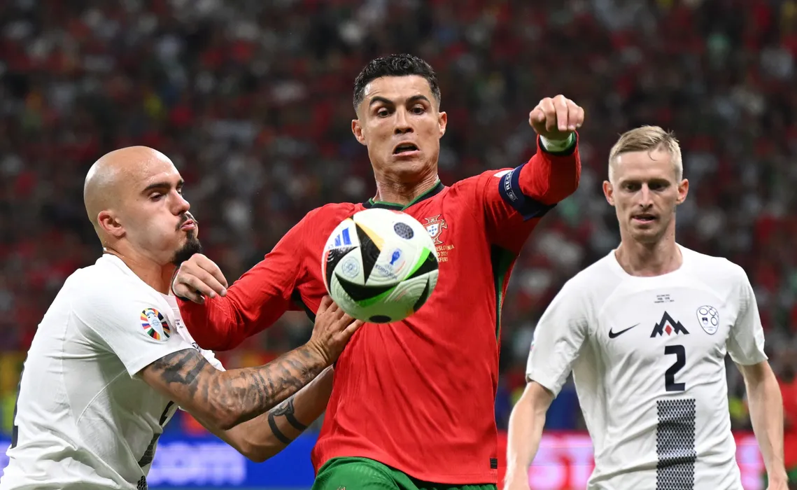01 July 2024, Hesse, Frankfurt/Main: Portugal's Cristiano Ronaldo (C) battles for the ball with Slovenia's Vanja Drkusic (L) and Zan Karnicnik during the UEFA Euro 2024 round of 16 football match between Portugal and Slowenien at the Frankfurt Arena. Photo: Arne Dedert/dpa/HEPTA/SPORT PICTURES