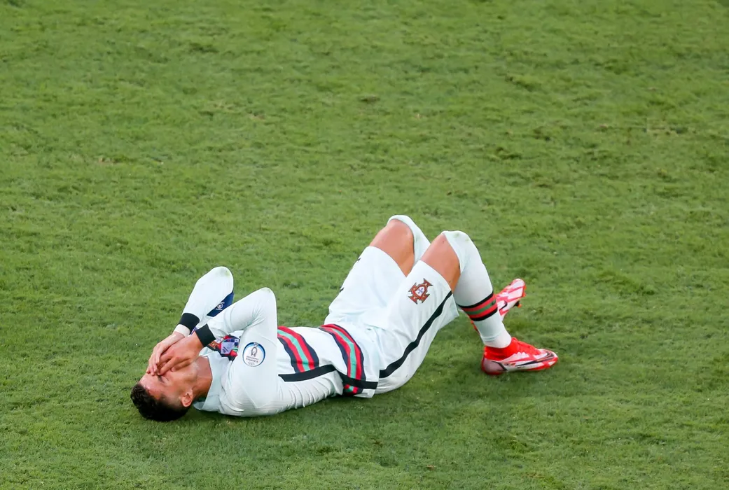 27 June 2021, Spain, Seville: Portugal's Cristiano Ronaldo lies on the turf after a collision during the UEFA EURO 2020 round of 16 soccer match between Belgium and Portugal at La Cartuja Stadium. Photo: Cezaro De Luca/dpa