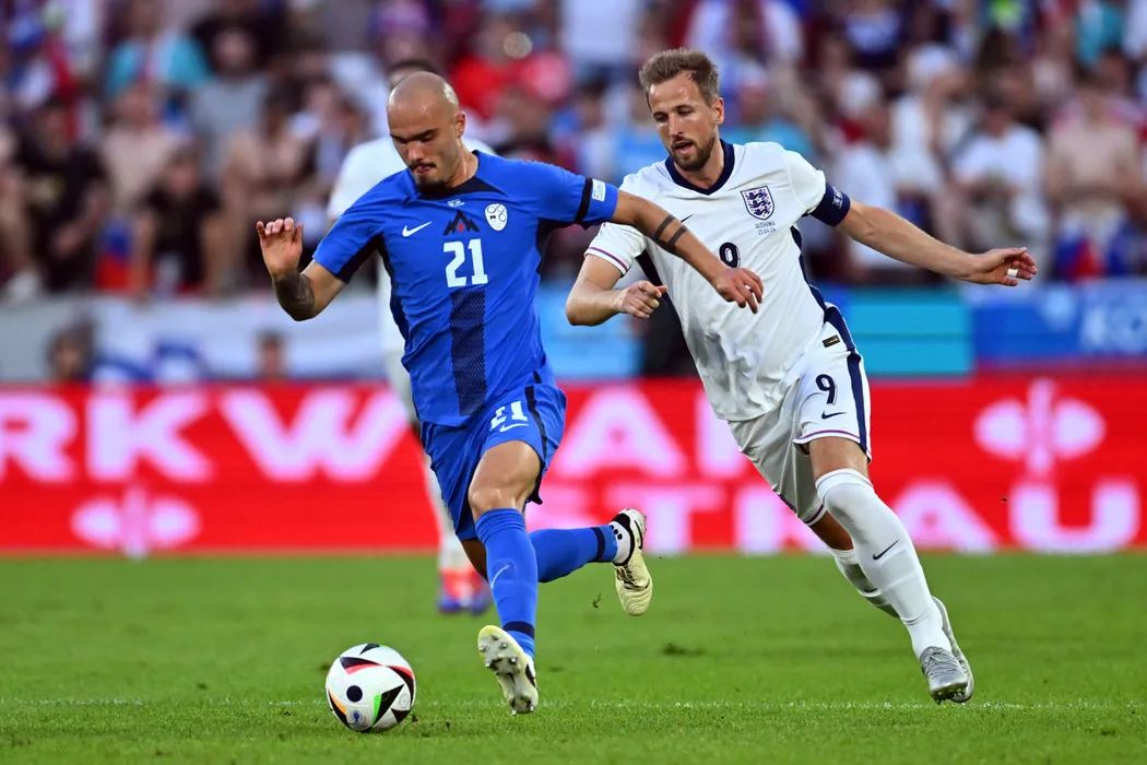 25 June 2024, North Rhine-Westphalia, Cologne: Slovenia's Vanja Drkusic (L) and England's Harry Kane fight for the ball during the UEFA EURO 2024 Group C soccer match between England and Slovenia at the Col/HEPTA/SPORT PICTURESogne Stadium. Photo: Marius Becker/dpa