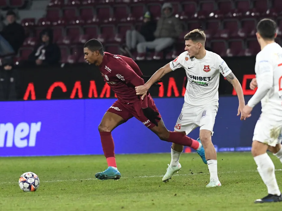 Mohammed Kesselly Kamara si Tiberiu Ionut Capusa in meciul de fotbal dintre FC CFR 1907 Cluj si AFC Hermannstadt, contand pentru Superliga Superbet, desfasurat pe Stadionul Dr.Constantin Radulescu din Cluj-Napoca, miercuri 5 februarie 2025. © FOTO: Flaviu Buboi/SPORT PICTURES