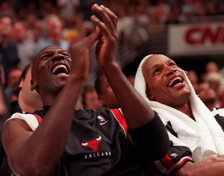 April 20, 2020, USA: Michael Jordan and Ron Harper are all smiles as a playoff game in 1998 winds down. (Credit Image: © TNS via ZUMA Wire)