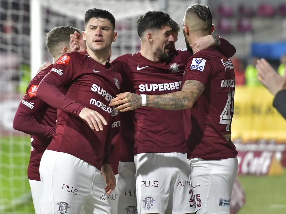 Marko Dugandzic se bucura dupa un gol marcat alaturi de Cristian Ionut Sapunaru si Alexandru Cristian Albu in meciul de fotbal dintre Rapid Bucuresti si Sepsi OSK Sfantu Gheorghe, contand pentru Superliga Superbet, desfasurat pe Stadionul Rapid Giulesti din Bucuresti, vineri 20 ianuarie 2023. © FOTO:Razvan Pasarica/SPORT PICTURES