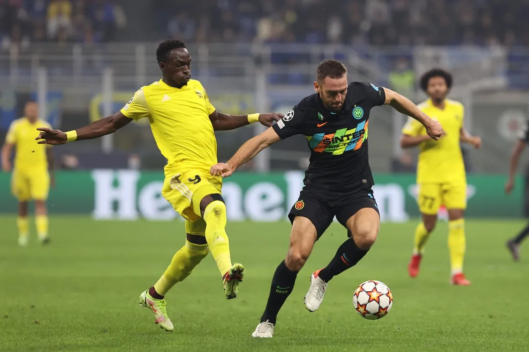 Stefan de Vrij of FC Internazionale fights for the ball against Adama Traore of FC Sheriff Tiraspol