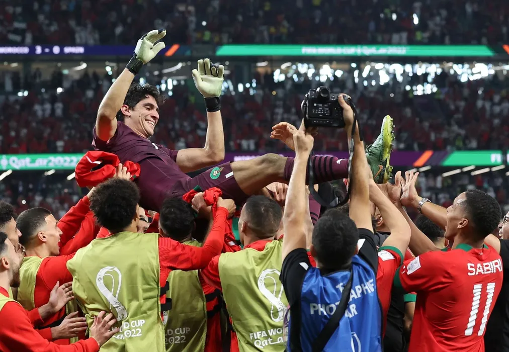 Football - 2022 FIFA World Cup Qatar - Round Sixteen - Morocco vs Spain - Education City Stadium, Al-Rayyan - Tuesday 6th December 2022. Yassine Bounou of Morocco is held up by team-mates at full time Credit: COLORSPORT