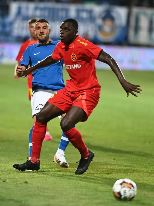 Constantin Valentin Budescu si Joyskim Aurelien Dawa Tchakonte in meciul de fotbal dintre Farul Constanta si FCSB, contand pentru Superliga Superbet, desfasurat pe Stadionul central al Academiei Gheorghe Hagi din Ovidiu, duminica 17 septembrie 2023. © FOTO:Razvan Pasarica/SPORT PICTURES