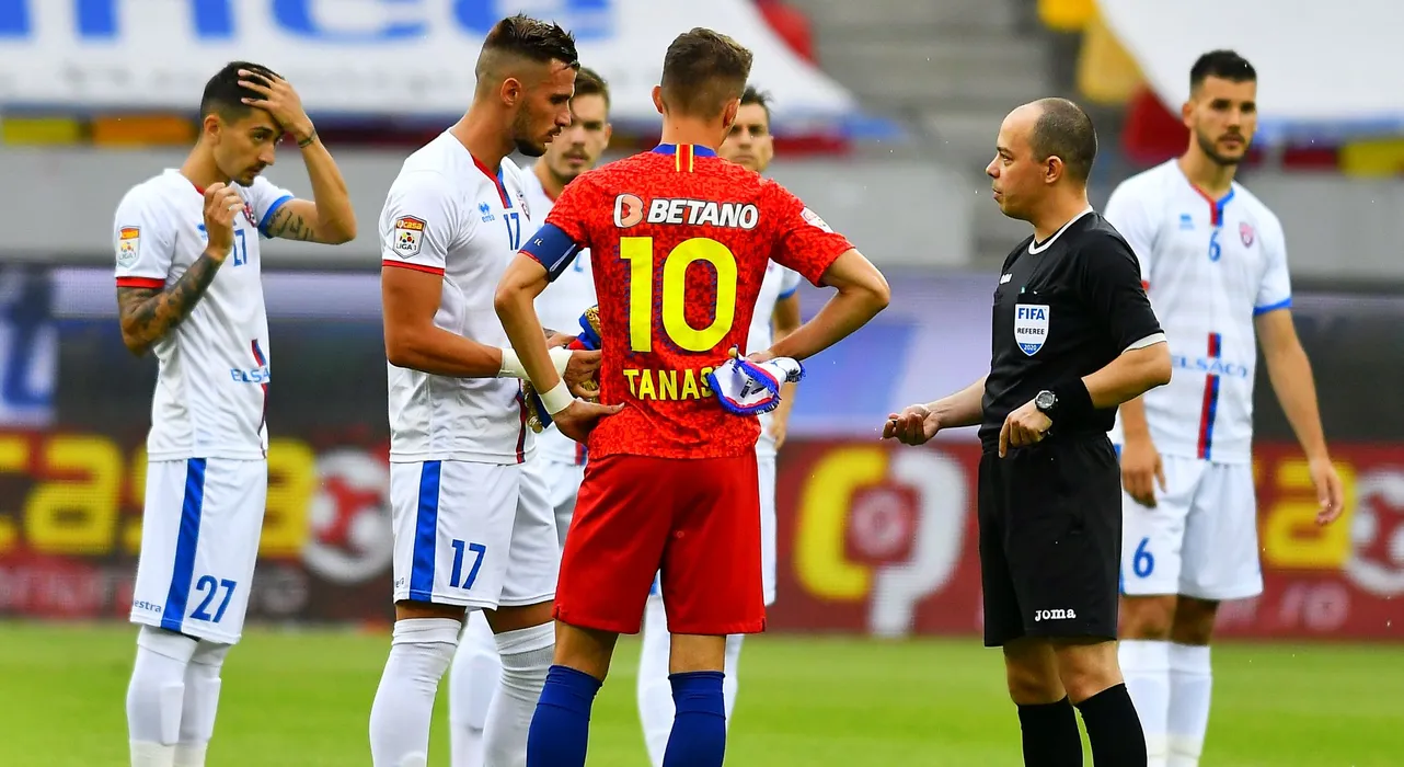 Capitanii Marko Dugandzic si Florin Tanase alaturi de arbitrul central Marius Avram in meciul de fotbal dintre FCSB si FC Botosani, contand pentru play-off-ul Ligii 1 Casa Pariurilor, disputat fara spectatori pe Arena Nationala din Bucuresti, sambata 4 iulie 2020. © FOTO:Razvan Pasarica/SPORT PICTURES