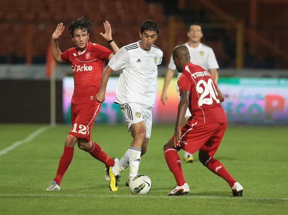 Steven Berghuis (S) si Dwight Tiendalli (D), de la Twente Enschede, se lupta pentru balon cu Razvan Neagu (C), de la FC Vaslui, in meciul din mansa secunda a turului trei preliminar al Ligii Campionilor, disputat in Piatra Neamt, miercuri, 3 august 2011. ALEXANDRU HOJDA / MEDIAFAX FOTO