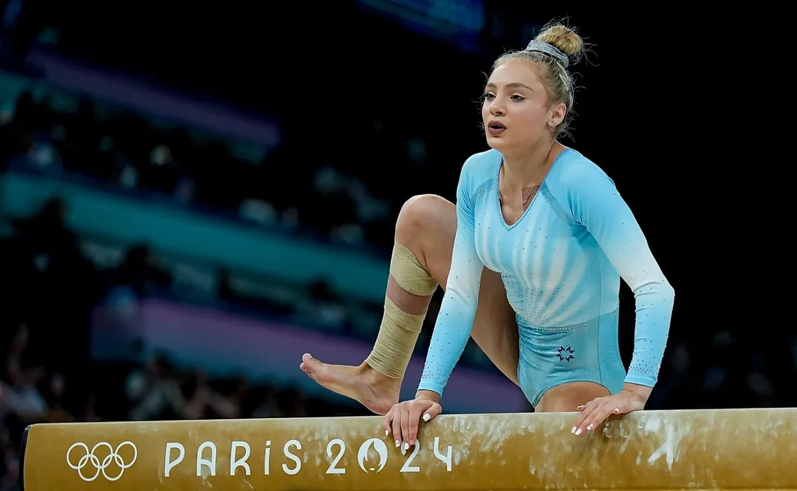 Sabrina Maneca-Voinea of Romania falls down during the Women's Balance Beam Final on day ten of the Olympic Games Paris 2024 at Bercy Arena on August 5, 2024 in Paris, France.