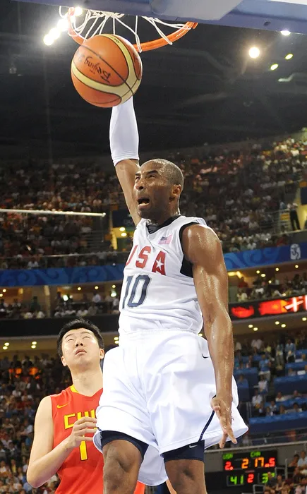 Kobe Bryant (R) of the US dunks during the 2008 Beijing Olympic men's preliminary round group B basketball match against China at the Olympic basketball Arena in Beijing on August 10, 2008. AFP PHOTO/William WEST