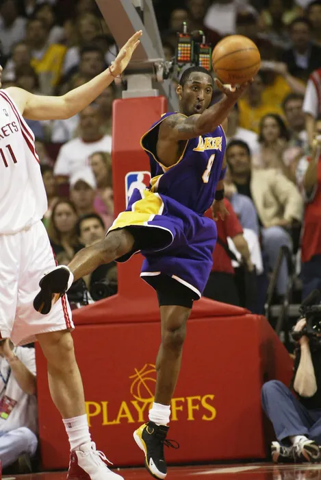 Kobe Bryant #8 of the Los Angeles Lakers flips up a shot after being fouled as Yao Ming #11 of the Houston Rockets defends during Game three of the Western Conference Quarterfinals during the 2004 NBA Playoffs 23 April 2004 at the Toyota Center in Houston, Texas. (Stephen Dunn/Getty Images/AFP) FOR NEWSPAPERS AND TV USE ONLY *** Local Caption ***