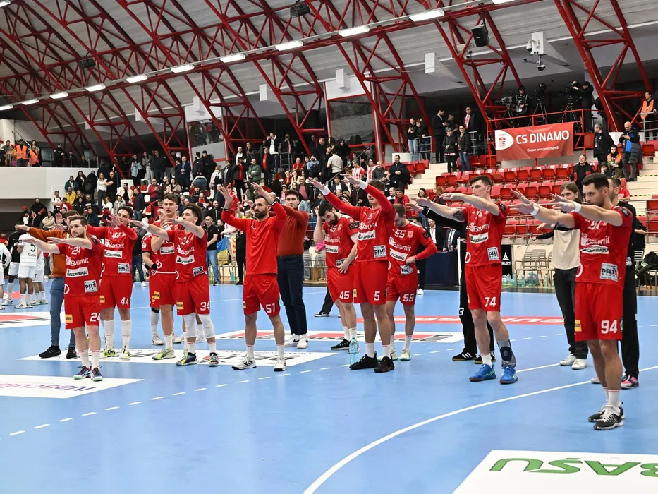 Handbalistii dinamovistiNicusor Andrei Negru, Daniel Stanciuc, Lazar Kukic, Javier Gaminde Humet, Rosta Miklos, Calin Dedu, Viachaslau Bokhan si Robert Mihai Militaru saluta galeria dupa meciul de handbal masculin dintre Dinamo Bucuresti si Sporting Lisabona, din cadrul EHF European League, desfasurat in Sala Dinamo din Bucuresti, marti 5 martie 2024.,Image: 854004747, License: Rights-managed, Restrictions: , Model Release: no