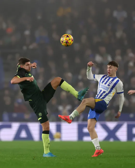 27 December 2024, United Kingdom, Brighton And Hove: Brentford's Vitaly Janelt (L) and Brighton and Hove Albion's Brajan Gruda battle for the ball during the English Premier League soccer match between Brighton and Hove Albion and Brentford at the Amex Stadium. Photo: Steven Paston/PA Wire/dpa