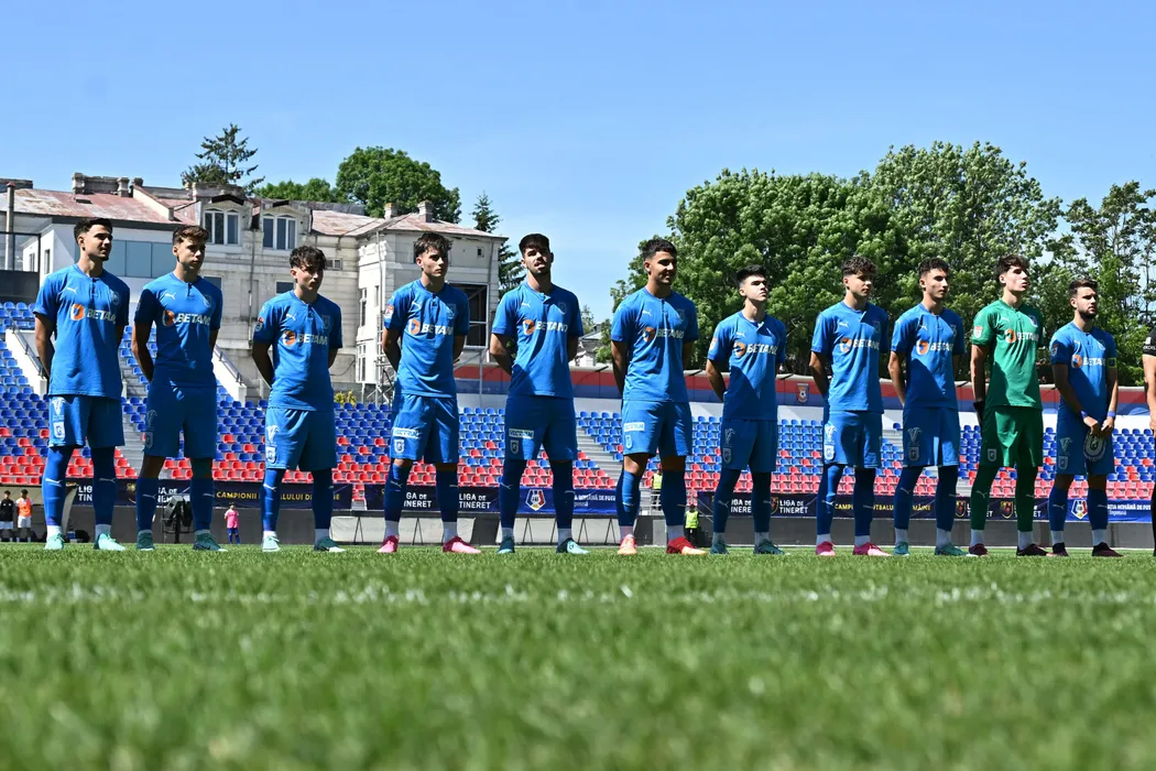 Fotbalistii craioveni la startul meciului de fotbal dintre Universitatea Craiova U18 si Universitatea Cluj U18, finala mica a Cupei de Tineret, desfășurat pe Stadionul Eugen Popescu din Targoviste, duminica 26 mai 2024. © FOTO: Răzvan PĂSĂRICĂ/SPORT PICTURES