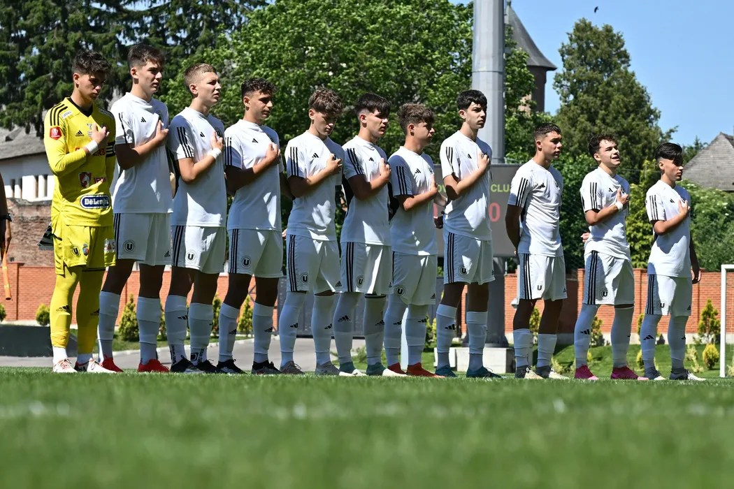 Fotbalistii clujeni la startul meciului de fotbal dintre Universitatea Craiova U18 si Universitatea Cluj U18, finala mica a Cupei de Tineret, desfășurat pe Stadionul Eugen Popescu din Targoviste, duminica 26 mai 2024. © FOTO: Răzvan PĂSĂRICĂ/SPORT PICTURES