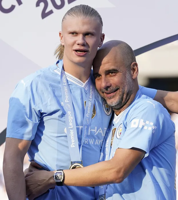 May 19, 2024, Manchester: Manchester, England, 19th May 2024. Josep Guardiola coach of Manchester City (R) greets Erling Haaland of Manchester City after collecting his medal after winning the Premier league during the Premier League match at the Etihad Stadium, Manchester. (Credit Image: