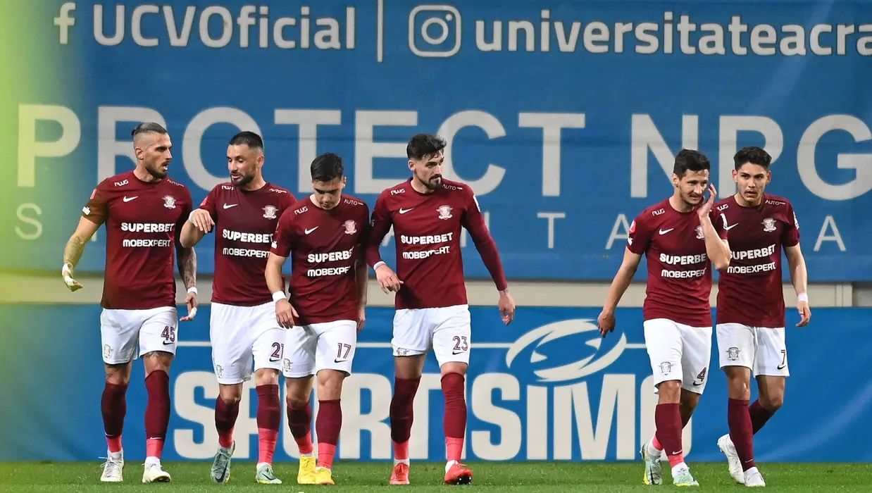 Bucurie a fotbalistilor rapidisti dupa un gol marcat cu Marko Dugandzic,Dragos Grigore,Stefan Calin Panoiu, Alexandru Cristian Albu, Ljuban Crepulja si Antonio Valentin Sefer in meciul de fotbal dintre Universitatea Craiova si Rapid Bucuresti, contand pentru Play-off-ul Superligii Superbet, desfasurat pe Stadionul Ion Oblemenco din Craiova, duminica 16 aprilie 2023. Craiova *** The joy of the rapid players after a goal scored by Marko Dugandzic, Dragos Grigore, Stefan Calin Panoiu, Alexandru Cristian Albu, Ljuban Crepulja and Antonio Valentin Sefer in the football match between the University of Craiova and Rapid Bucharest, counting for the Play off of the Superbet Super League, held on Ion Oblemenco Stadium in Craiova, Sunday April 16, 2023 Craiova Copyright: xRazvanxPasarica/SPORTxPICTURESx