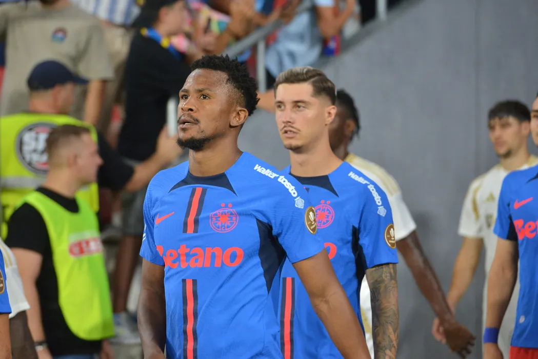 Siyabonga Ngezana și David Raul Miculescu la startul meciului de fotbal dintre FCSB și Sparta Praga, contând pentru preliminariile UEFA Champions League, desfășurat pe Stadionul Steaua din București, marți 13 august 2024. © FOTO: Alexandra Cristina GRIGORESCU/SPORT PICTURES