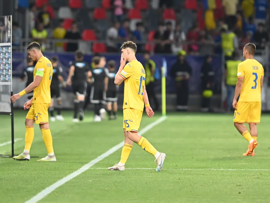 Fotbalistii romani Bogdan Racovitan si Andrei Borza parasesc tristi terenul meciul de fotbal dintre Romania U21 si Spania U21, contand pentru Campionatul European U21, desfasurat pe Stadionul Steaua din Bucuresti, miercuri 21 iunie 2023.© FOTO:Razvan Pasarica/SPORT PICTURES