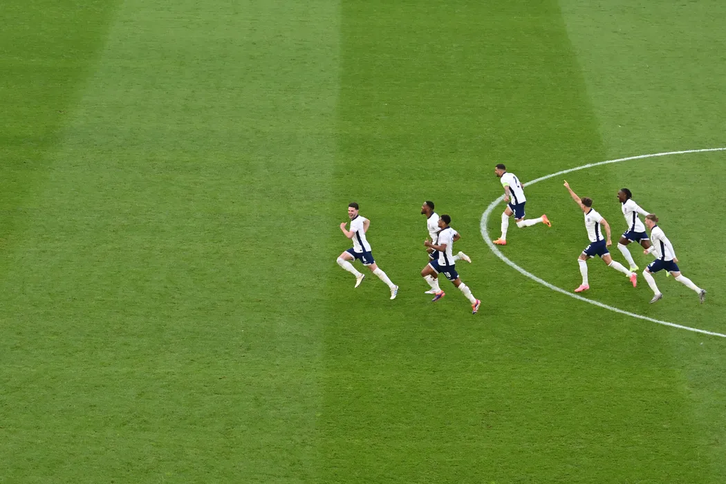 06 July 2024, North Rhine-Westphalia, Duesseldorf: England's players run across the pitch celebrating after the decisive penalty kick during the UEFA Euro 2024 quarter-final soccer match between England and Switzerland at Duesseldorf Arena. Photo: David Inderlied/dpa