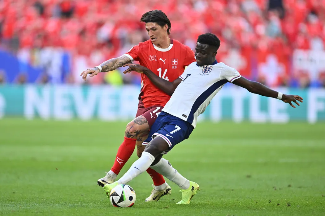 06 July 2024, North Rhine-Westphalia, Duesseldorf: Switzerland's Steven Zuber and England's Bukayo Saka (R) battle for the ball during the UEFA Euro 2024 quarter-final soccer match between England and Switzerland at Duesseldorf Arena. Photo: Marius Becker/dpa