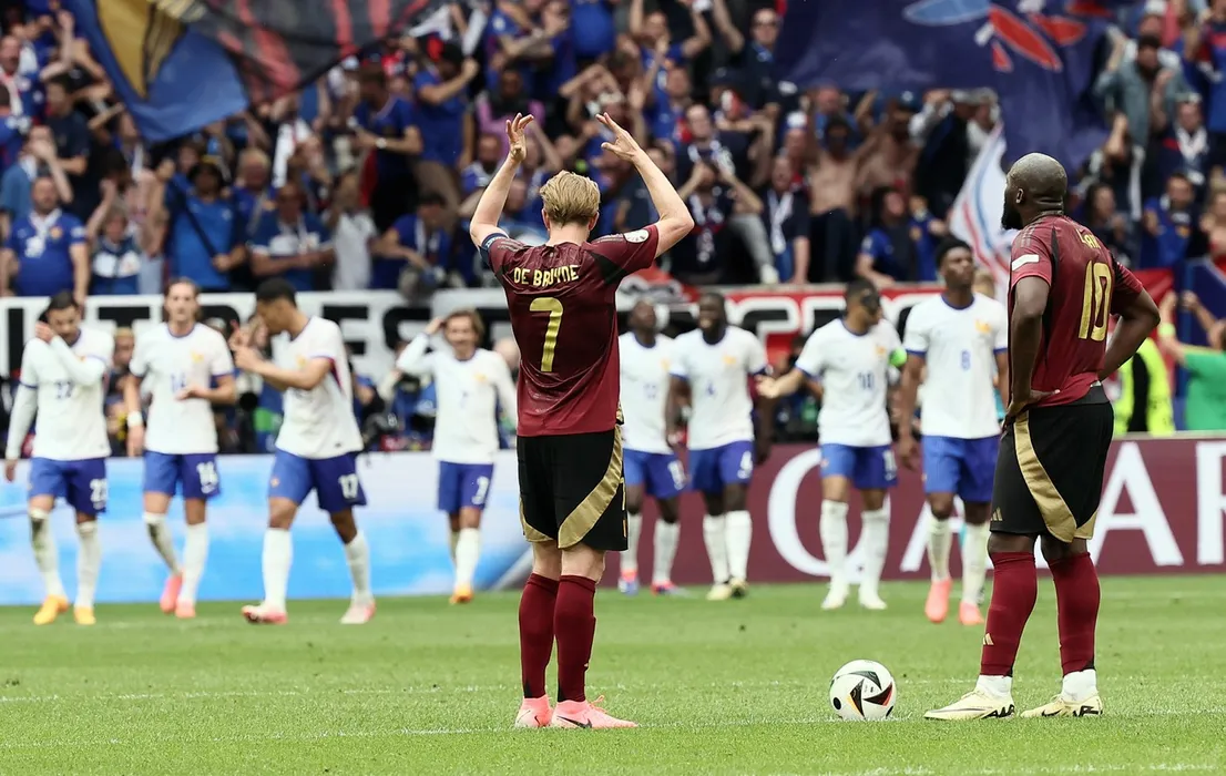 Belgium's Kevin De Bruyne and Belgium's Romelu Lukaku pictured after the 1-0 of France at a soccer game between France and Belgian national soccer team Red Devils, Monday 01 July 2024 in Dusseldorf, Germany, the Round of 16 game in the UEFA Euro 2024 European championships. BELGA PHOTO BRUNO FAHY,Image: 886373591, License: Rights-managed, Restrictions: *** World Rights Except Belgium and France *** BELOUT FRAOUT, Model Release: no