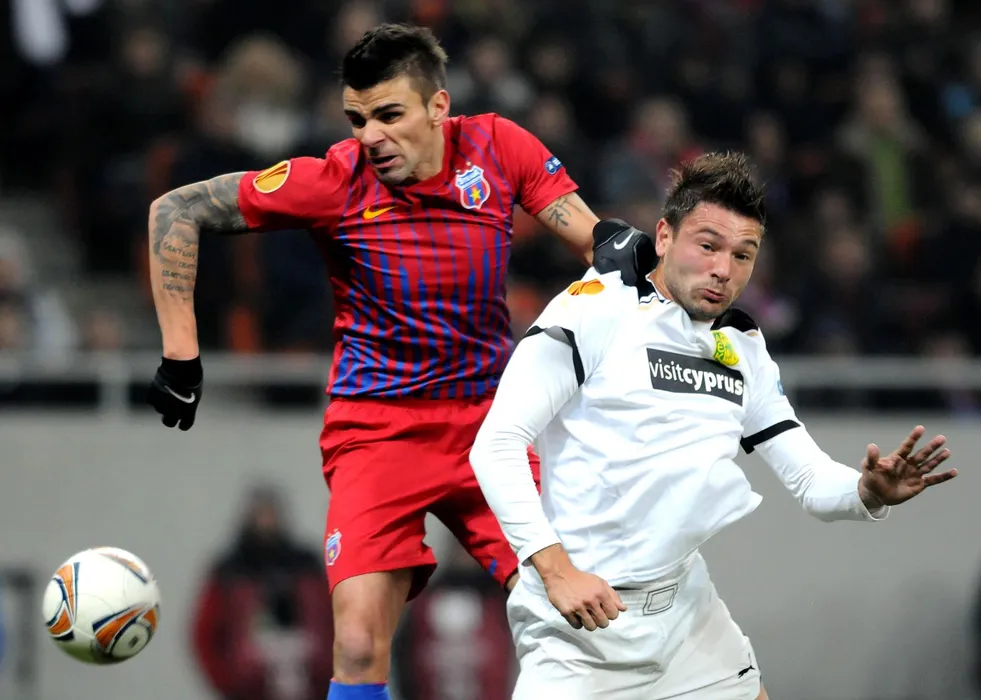 Miljan Mrdakovic în duel cu Valentin Iliev / AEK Larnaka - FCSB (29 septembrie 2011)