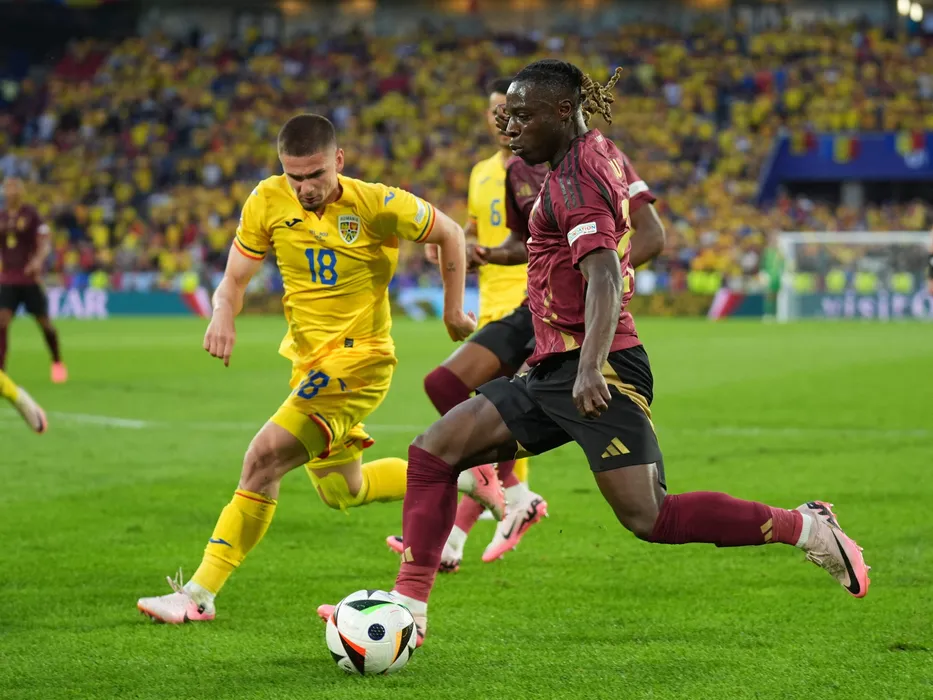 COLOGNE, GERMANY - JUNE 22: Jeremy Doku (R) of Belgium in action against Razvan Marin(18) of Romania during the UEFA EURO 2024 group stage match between Belgium and Romania at Cologne Stadium on June 22, 2024 in Cologne, Germany. Mahmut Serdar Alakus / Anadolu/ABACAPRESS.COM