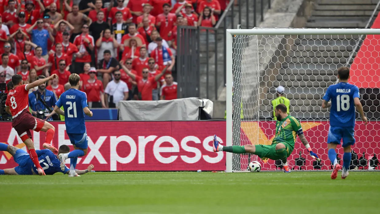 29 June 2024, Berlin: Switzerland's Remo Freuler scores his side's first goal during the UEFA Euro 2024 round of 16 soccer match between Switzerland and Italy at Olympiastadion Berlin. Photo: Robert Michael/dpa