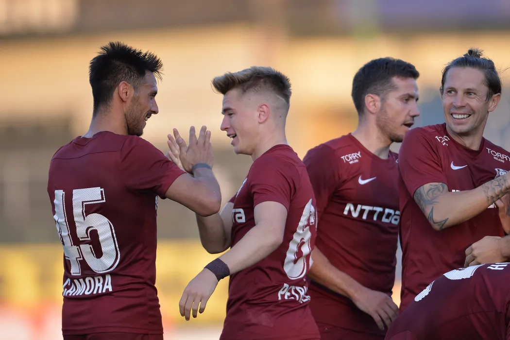 Claudiu Petrila de la CFR Cluj (C) este felicitat de coechipieri dupa ce a inscris in poarta echipei Academica Clinceni, intr-o partida contand pentru prima etapa a noului sezon al Ligii 1, duminica 23 august 2020, la Clinceni. ALEXANDRU DOBRE / MEDIAFAX FOTO