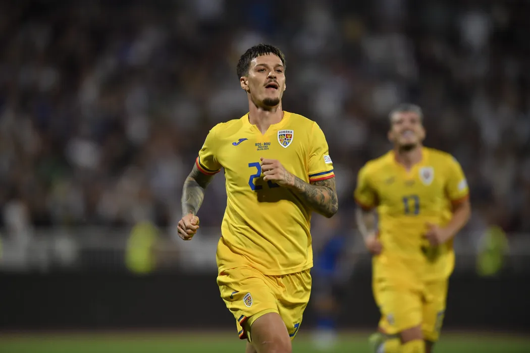 Dennis Man după un gol marcat în meciul de fotbal dintre Kosovo și România, contând pentru Liga Națiunilor, desfășurat pe Stadionul Fadil Vokrri din Priștina, vineri 6 septembrie 2024. © FOTO: SPORT PICTURES
