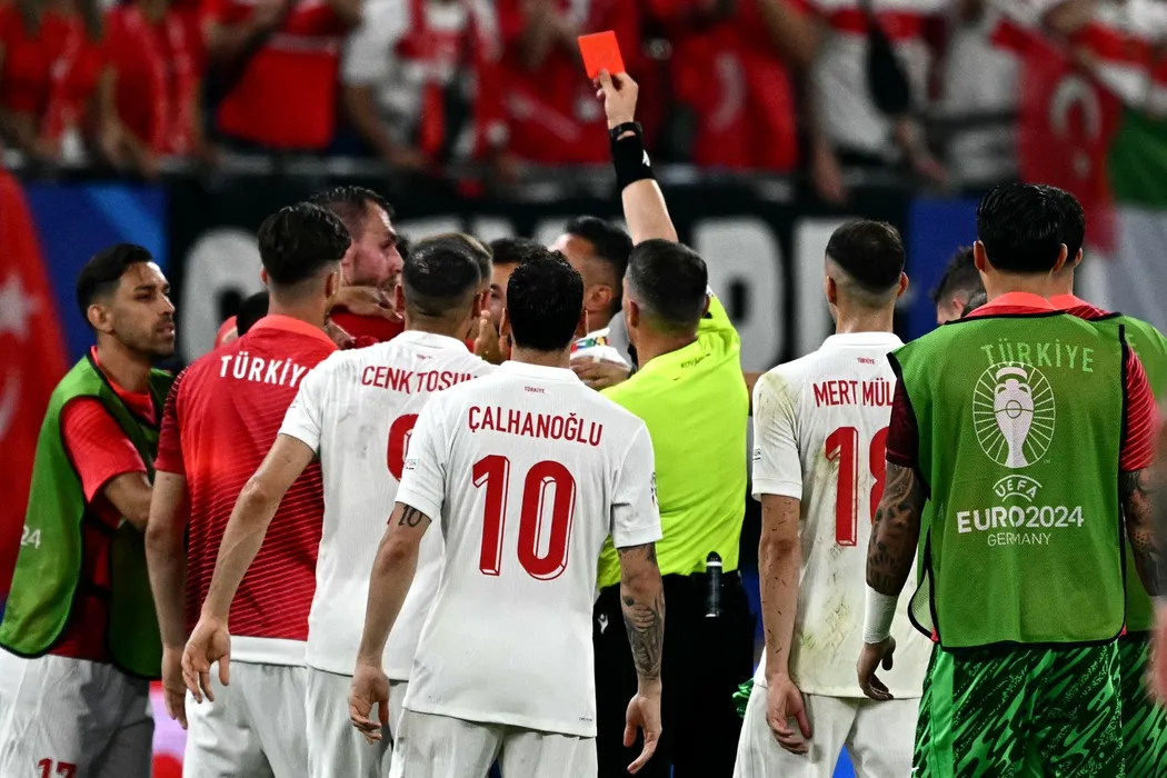Romanian referee Istvan Kovacs shows a red card to Czech Republic's forward #19 Tomas Chory (behind) during the UEFA Euro 2024 Group F football match between the Czech Republic and Turkey at the Volksparkstadion in Hamburg on June 26, 2024.,Image: 885015884, License: Rights-managed, Restrictions: , Model Release: no