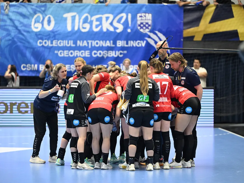 Handbalistele daneze la un timeout alaturi de antrenorul lor Tomas Axner in meciul de handbal feminin dintre CSM Bucuresti si Team Esbjerg, din cadrul Ligii Campionilor, desfasurat in Sala Polivalenta Ioan Kunst Ghermanescu din Bucuresti, duminica 26 aprilie 2026. © FOTO:Razvan Pasarica/SPORT PICTURES