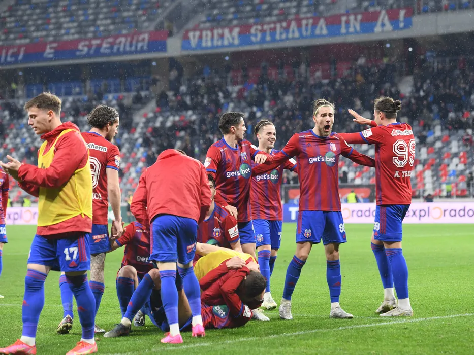 Bucurie a fotbalistilor stelisti dupa un gol marcat cu Dean Beta, Stefan Bodisteanu si Alexandru Sabau si Atanas Trica in meciul de fotbal dintre CSA Steaua Bucuresti si Politehnica Iasi, contand pentru Play-off-ul Ligii a-2-a Casa Pariurilor, desfasurat pe Stadionul Steaua-Ghencea din Bucuresti, marti 11 aprilie 2023. © FOTO:Razvan Pasarica/SPORT PICTURES