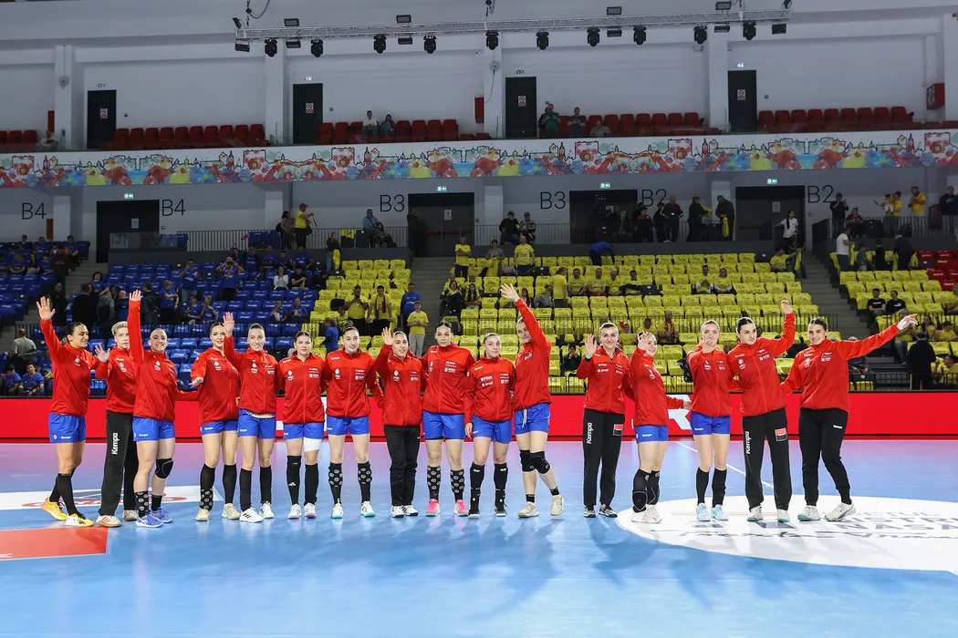 Handbalistele romance la startul meciului de handbal dintre Romania si Italia, ccontand pentru calificarea la Campionatul Modial de handbal feminin din 2025, desfasurat in Sala Polivalentă Teraplast Arena din Bistrița, duminica 13 aprilie aprilie 2025. © FOTO: Sorin Pana/SPORT PICTURES
