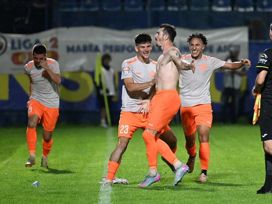 Dragos Huiban se bucură dupa un gol marcat alături de Gabriel Dumitru si Yassine Mohammed Zakir in meciul de fotbal dintre Metaloglobus Bucuresti si Politehnica Iasi, barajul retur pentru mentinere/promovare in Superliga Superbet, desfasurat pe Clinceni Arena din Clinceni, duminica 1 iunie 2025. © FOTO:Razvan Pasarica/SPORT PICTURES
