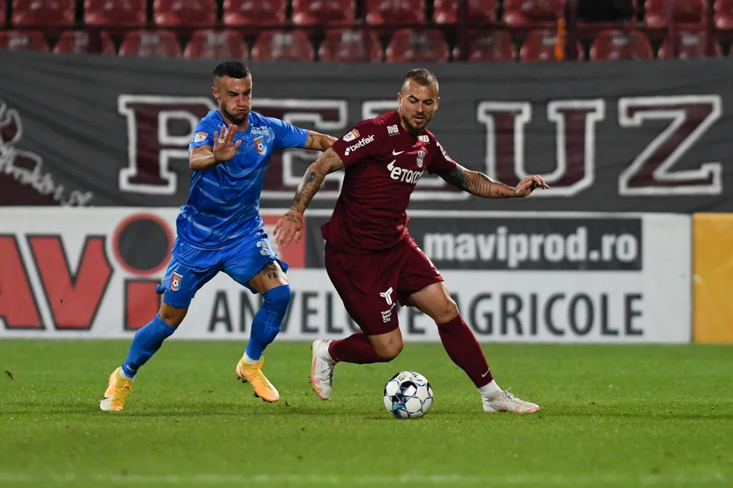 Denis Alibec (D), de la CFR Cluj, lupta pentru balon cu Nikolaos Baxevanos (S), de la Chindia Targoviste, in meciul de fotbal din etapa a III-a a Ligii 1, disputat pe stadionul Dr. Constantin Radulescu din Cluj-Napoca, sambata, 31 iulie 2021. FLAVIU BUBOI / MEDIAFAX FOTO