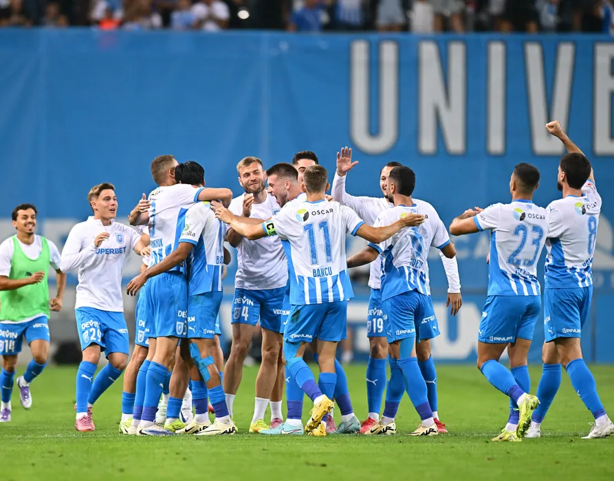 Fotbalistii craioveni se bucura dupa un gol marcat de Stefan Baiaram in meciul de fotbal dintre Universitatea Craiova si İstanbul Başakşehir FK, contand pentru Play-Off Conference League , desfasurat pe Stadionul Ion Oblemenco din Craiova, joi 28 august 2025. © FOTO:Raed Krishan/SPORT PICTURES